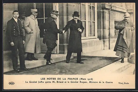 AK Le Général Joffre quitte M. Briand et le Général Roques, Ministre de la Guerre