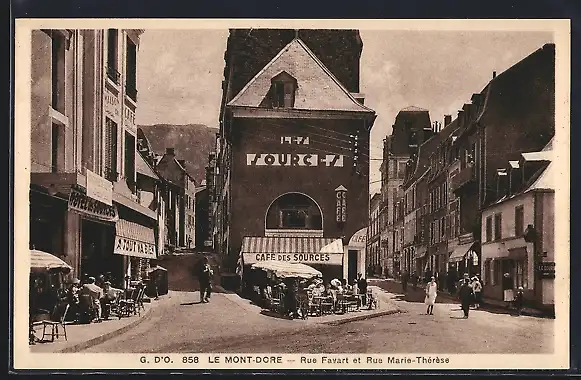 AK Le Mont-Dore, Rue Favart et Rue Marie-Thérèse avec le Café des Sources