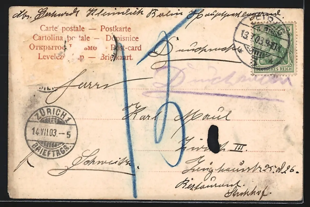 Personenbezogene Daten auf der Rückseite der Karte wurden durch blauen Textmarker unkenntlich gemacht. Die blauen Stellen sind auf die Vorderseite durchgeweicht und wirken sich negativ auf das Postkartenfoto aus