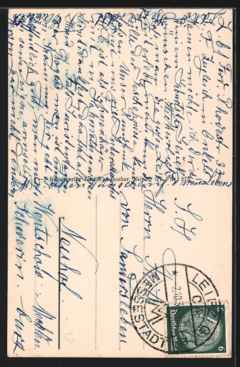 Personenbezogene Daten auf der Rückseite der Karte wurden durch blauen Textmarker unkenntlich gemacht. Die blauen Stellen sind auf die Vorderseite durchgeweicht und wirken sich negativ auf das Postkartenfoto aus