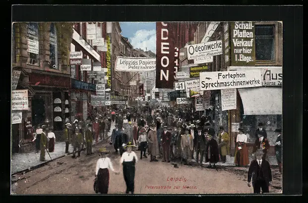 AK Leipzig, Petersstrasse mit Menschenmenge zur Zeit der Leipziger Messe