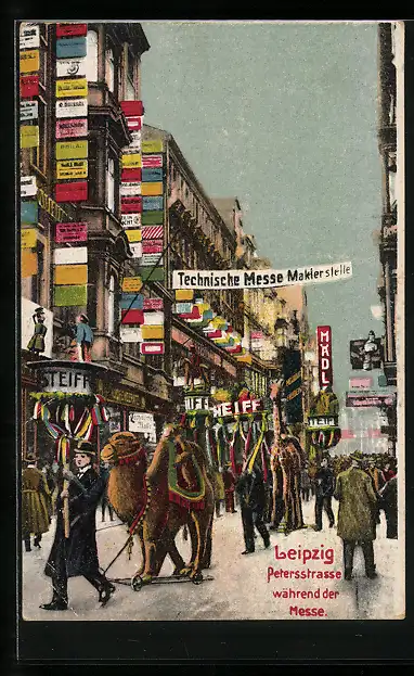 AK Leipzig, Petersstrasse während der Messe, Parade mit Kamel