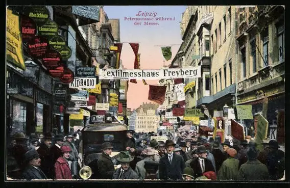 AK Leipzig, Petersstrasse während der Messe, Textilmesshaus Freyberg