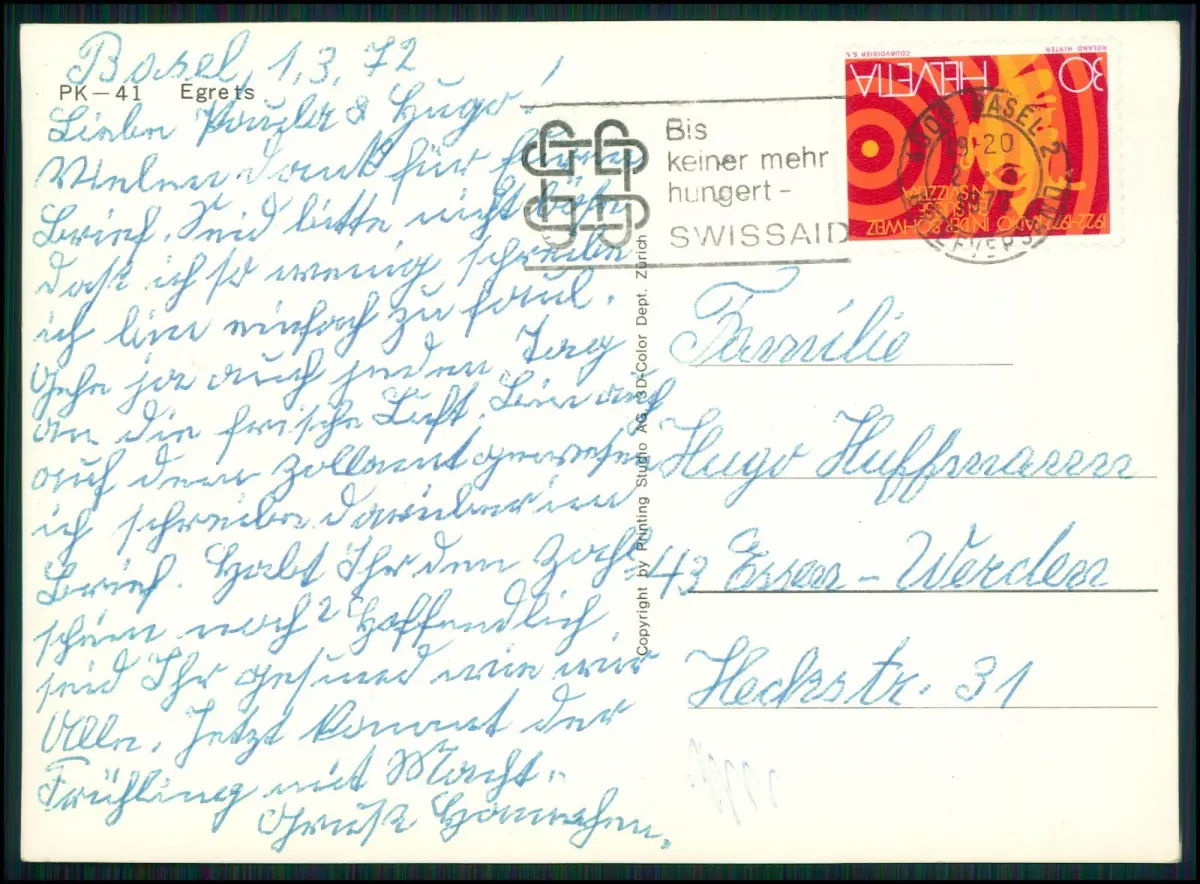 Postgelaufen am 13.07.1972 von Basel (Schweiz), frankiert mit 30 Rp SWISSAID-Marke. Stempel und handschriftlicher Text vollständig lesbar, gerichtet an eine Familie in Essen-Werden (Deutschland).