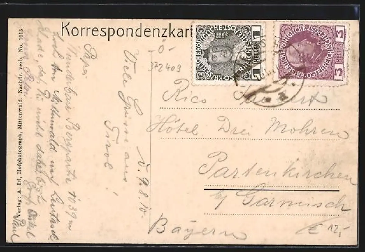 AK Leutasch in Tirol, Unterleutasch, Gasthaus zur Brücke mit Arnspitze und Brücke