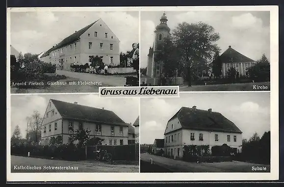 AK Liebenau, Gasthaus mit Fleischerei von Arnold Pietsch, Katholisches Schwesternhaus, Schule und Kirche