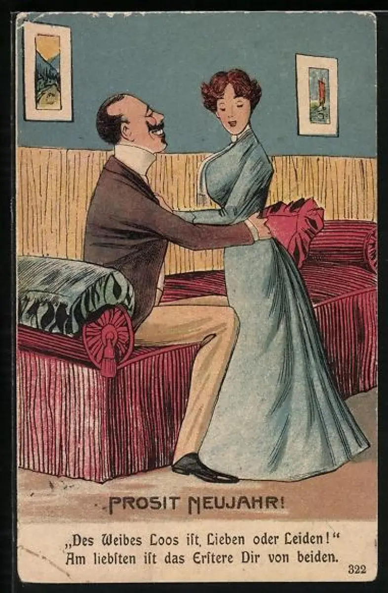 AK Liebespaar an einem Sofa, Des Weibes Loos ist, Lieben oder Leiden, Neujahr
