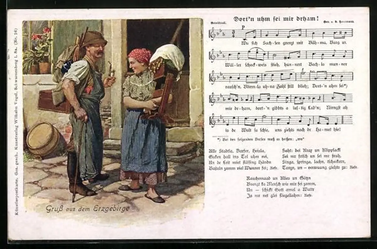 AK Lied Dort`n uhm sei mir drham!, Paar aus dem Erzgebirge