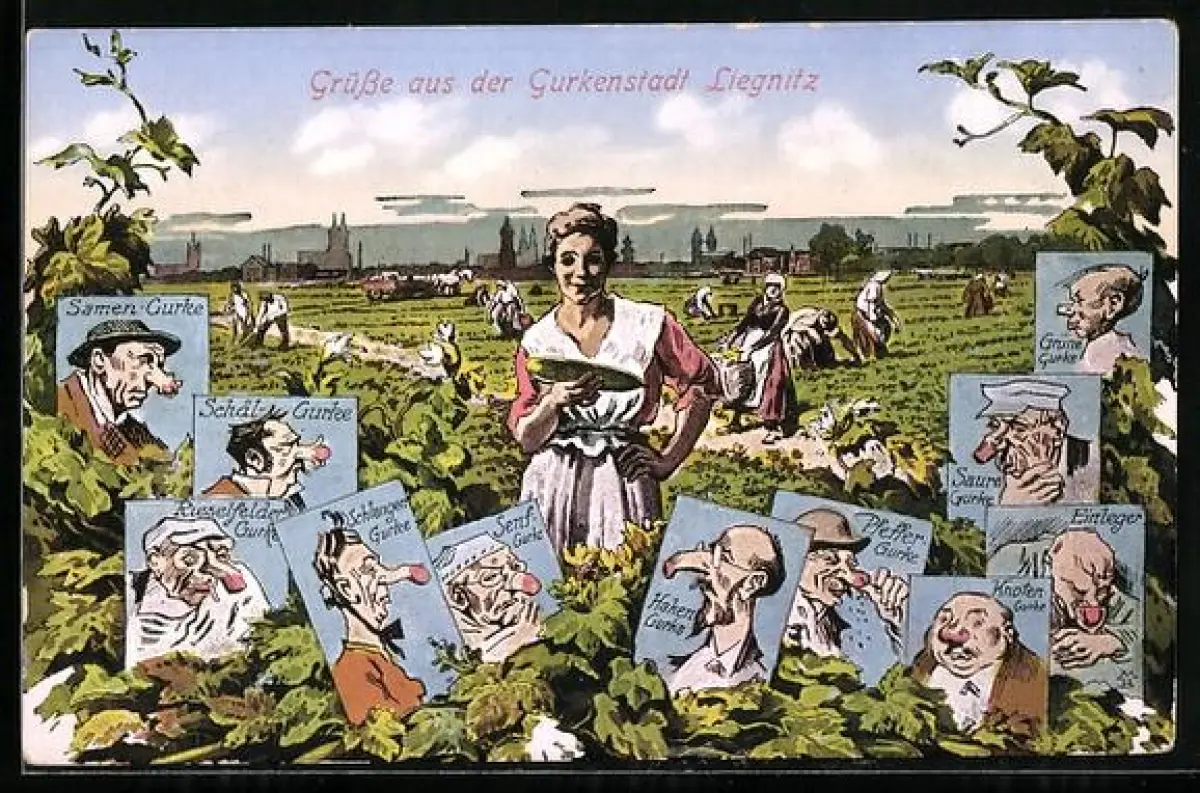 AK Liegnitz, Gurkenstadt, Gurken als Nasen in Gesichtern