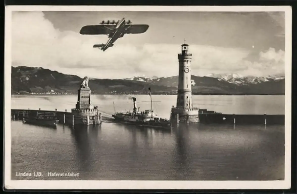 AK Lindau, Hafeneinfahrt mit Dampfer und Flugzeug