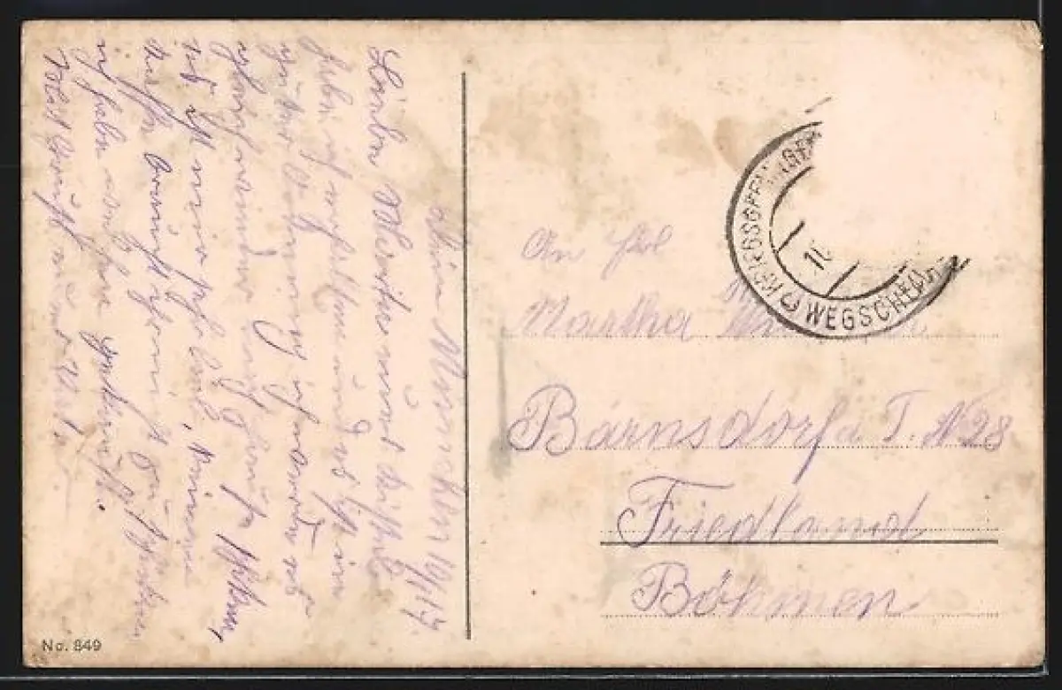 alte Ansichtskarte, gelaufen 1917, Briefmarke entfernt, rückseitig Oberflächenschaden, Ecken bestoßen, Eckknick unten li., Abriebspur unten re., guter Zustand
