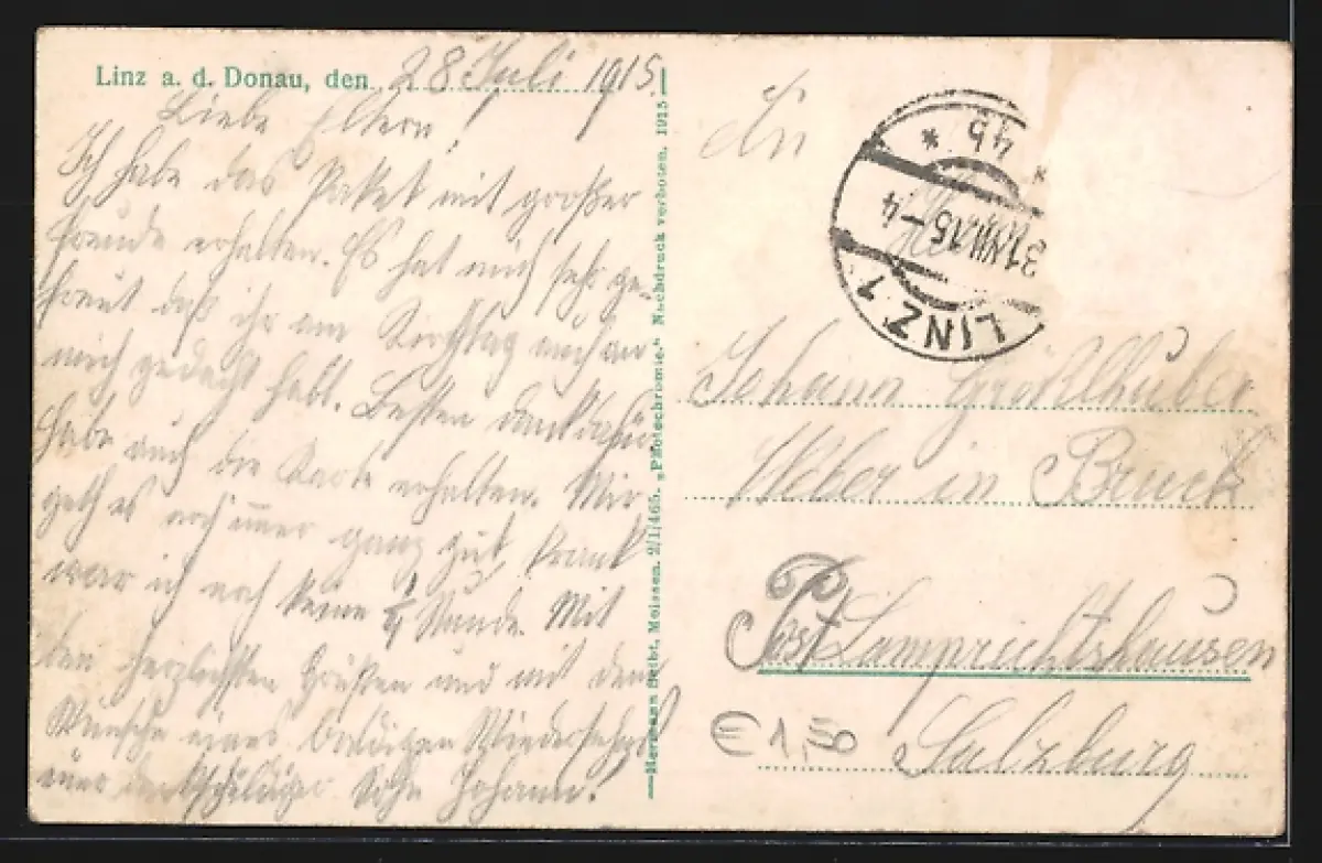 alte Ansichtskarte, gelaufen 1915, Briefmarke entfernt, rückseitig Oberflächenschaden, guter Zustand