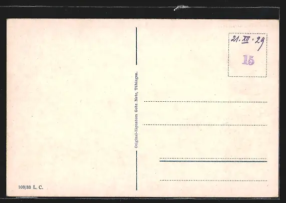Personenbezogene Daten auf der Rückseite der Karte wurden durch blauen Textmarker unkenntlich gemacht. Die blauen Stellen sind auf die Vorderseite durchgeweicht und wirken sich negativ auf das Postkartenfoto aus