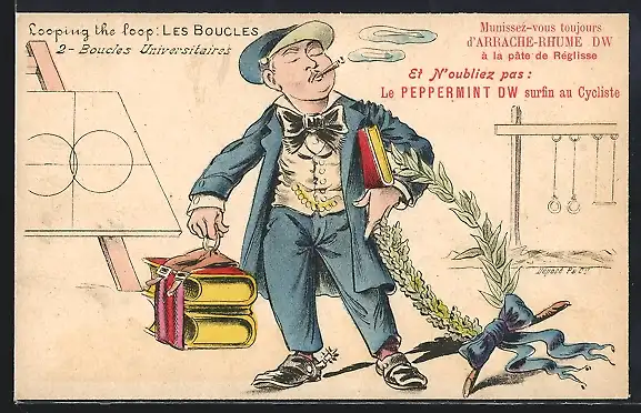 AK Looping the Loop: Les Boucles, Boucles Universitaires, Lässiger Student mit Zigarette, Büchern, Ehrenkranz, Schleife