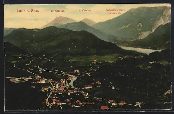 AK Lunz a. See, Totalansicht mit Ötscher aus der Vogelschau