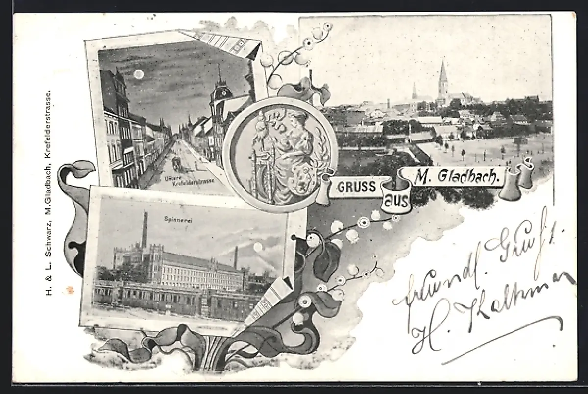 AK M. Gladbach, Spinnereri, Unterne Krefelderstrasse im Mondschein, Ortspanorama