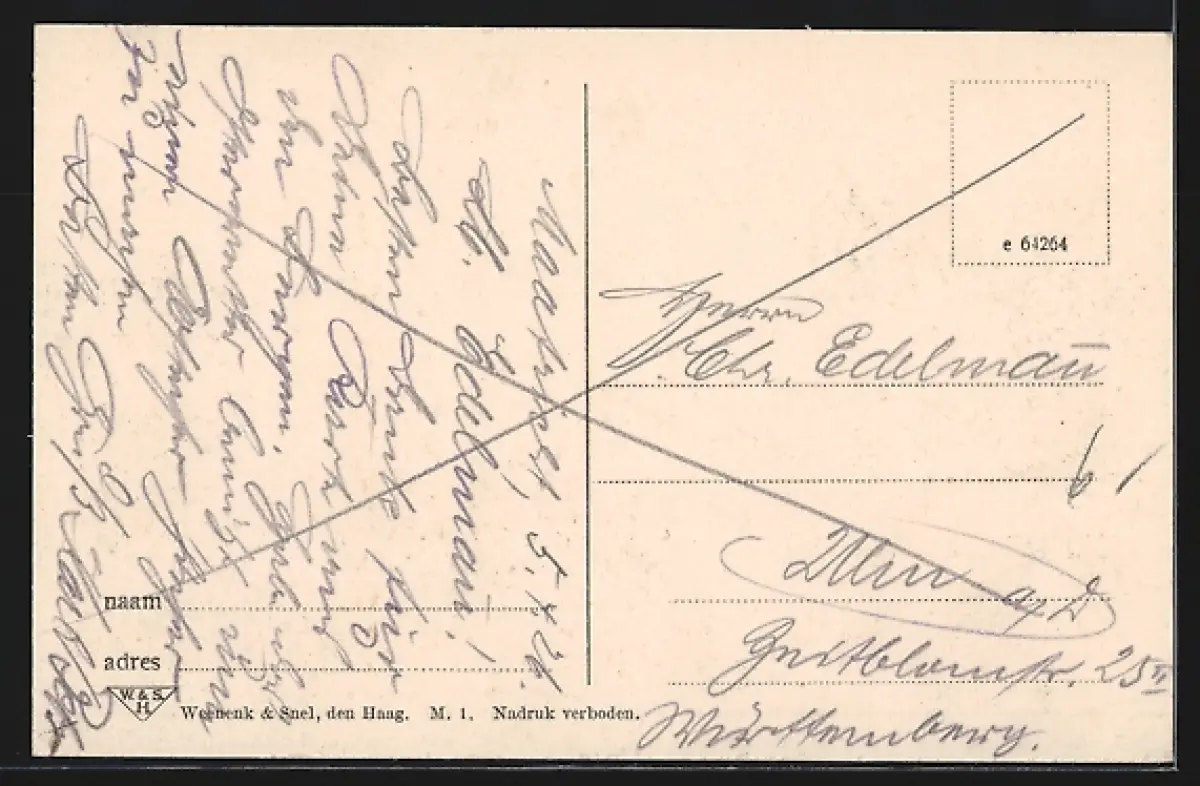 Personenbezogene Daten auf der Rückseite der Karte wurden durch blauen Textmarker unkenntlich gemacht. Die blauen Stellen sind auf die Vorderseite durchgeweicht und wirken sich negativ auf das Postkartenfoto aus