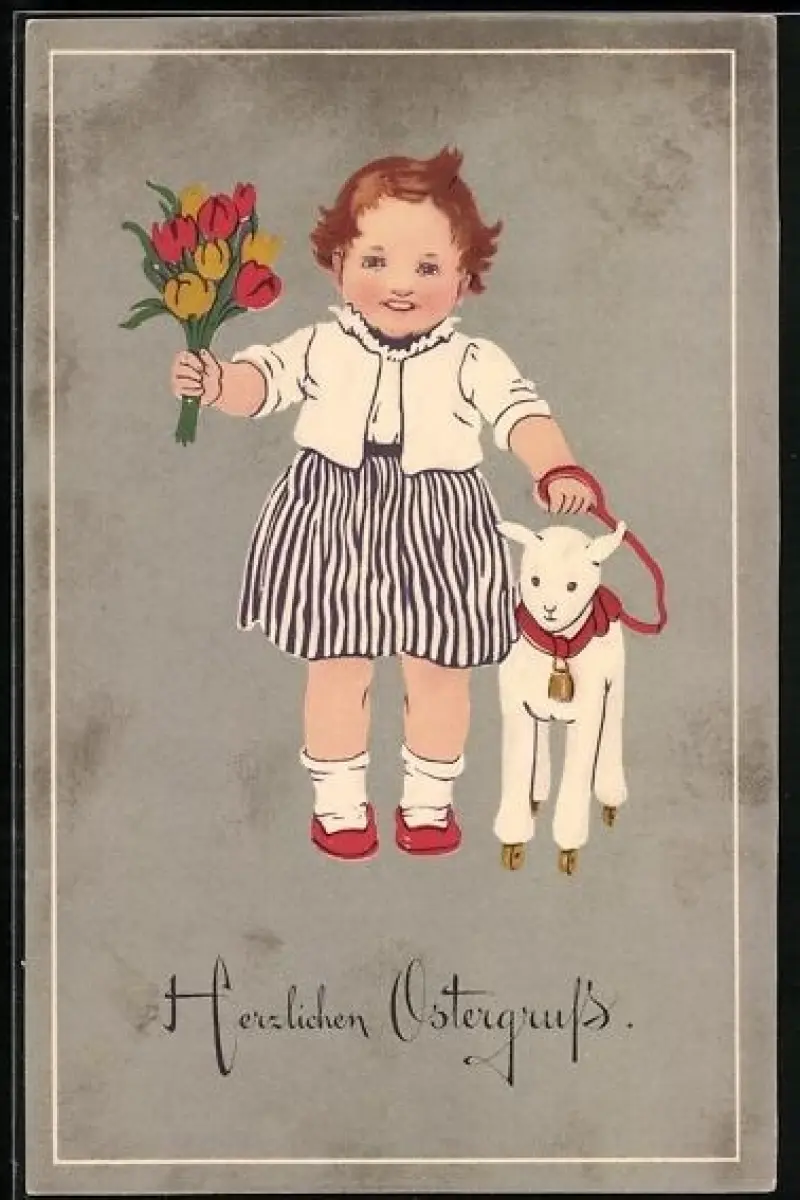 AK Mädchen gratuliert mit Blumen und Lamm an der Leine, Herzlichen Ostergruss!
