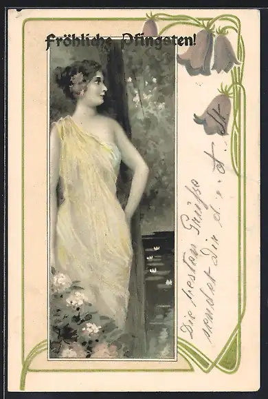 AK Mädchen mit Blume im Haar, Ornament mit Glockenblumen