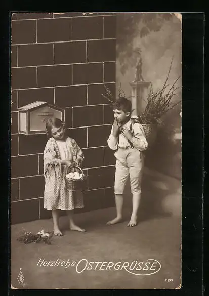 AK Mädchen mit Osterkorb vor einem Briefkasten