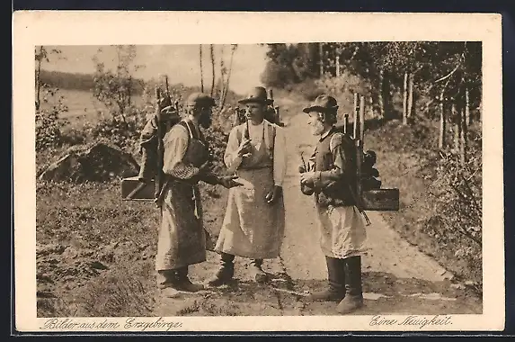 AK Männer aus dem Erzgebirge im Gespräch am Waldrand