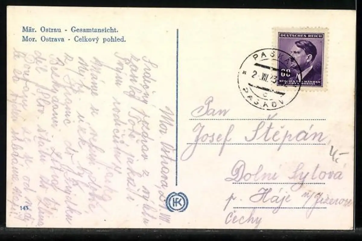 Personenbezogene Daten auf der Rückseite der Karte wurden durch blauen Textmarker unkenntlich gemacht. Die blauen Stellen sind auf die Vorderseite durchgeweicht und wirken sich negativ auf das Postkartenfoto aus