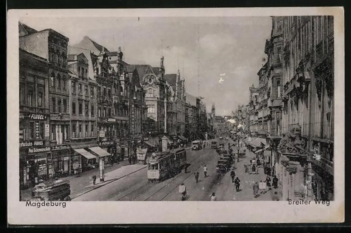 AK Magdeburg, Strasse Breiter Weg mit Strassenbahn