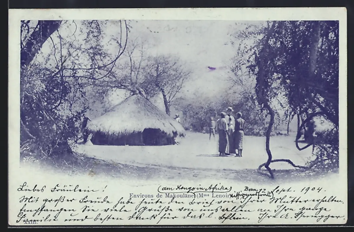 AK Makoulane, Mme Lenoir im Gespräch mit Eingeborenen, Strohgedeckte Hütte