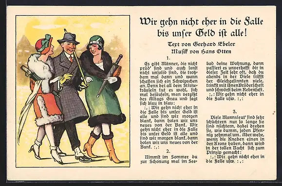 AK Mann in Begleitung zweier Damen mit Lied Wir gehn nicht eher in die Falle bis unser Geld ist alle