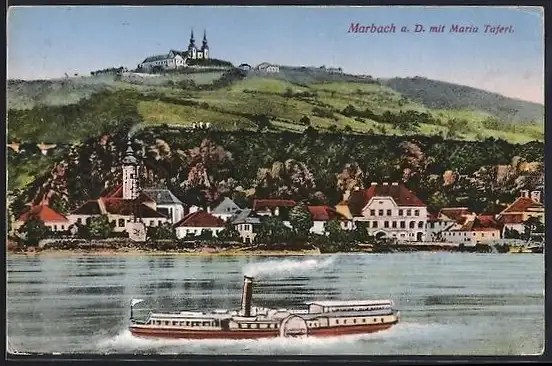 AK Marbach a. D., Ortsansicht mit Wallfahrtskirche Maria-Taferl, Raddampfer auf der Donau
