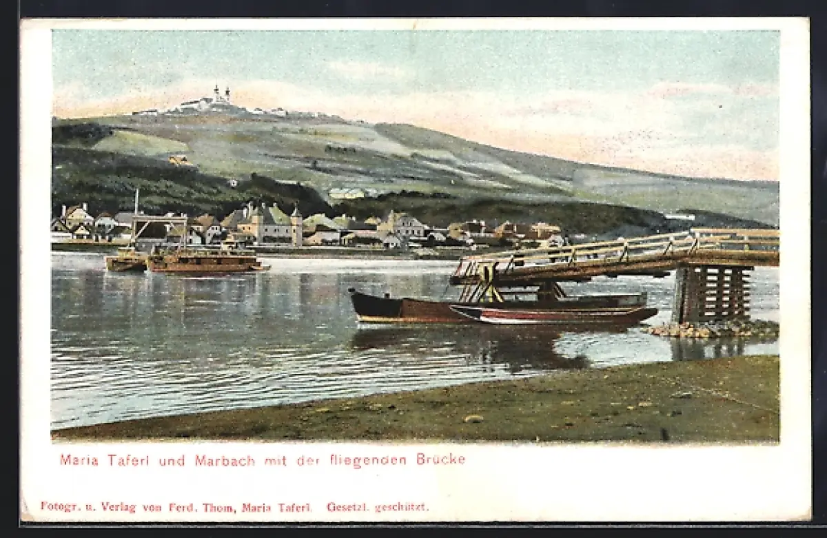 AK Marbach a. d. Donau, Fähre, fliegende Brücke, Wallfahrtskirche Maria Taferl