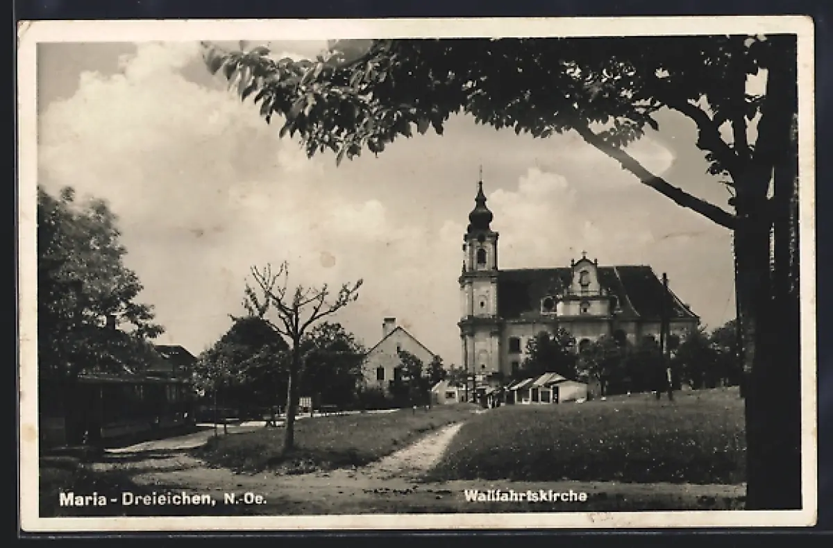 AK Maria-Dreieichen, Blick zur Wallfahrtskirche