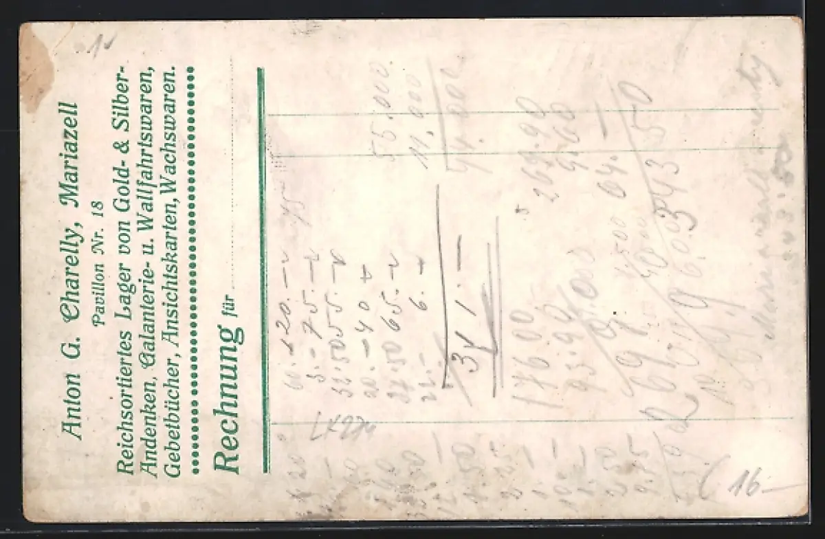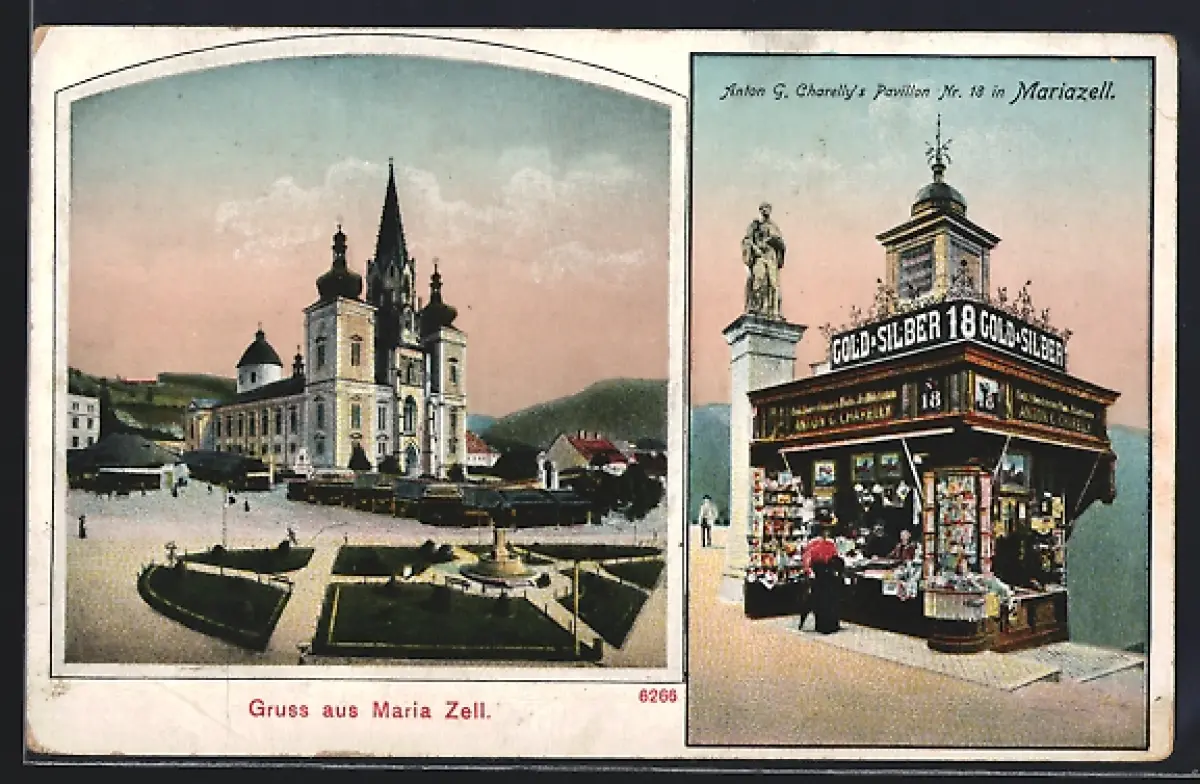 AK Maria Zell, Anton G. Charellys Pavillon Nr. 18, Verkauf von Ansichtskarten, Platz mit Kirche