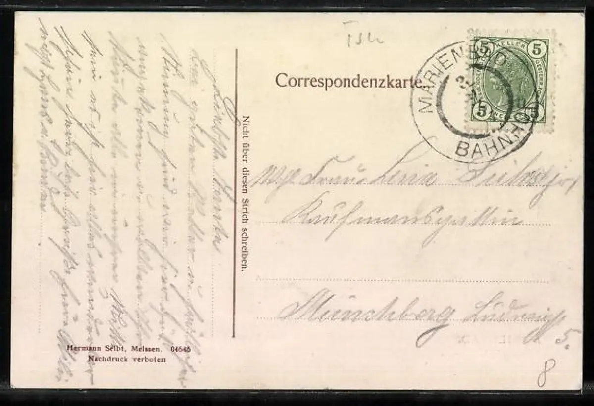 Personenbezogene Daten auf der Rückseite der Karte wurden durch blauen Textmarker unkenntlich gemacht. Die blauen Stellen sind auf die Vorderseite durchgeweicht und wirken sich negativ auf das Postkartenfoto aus