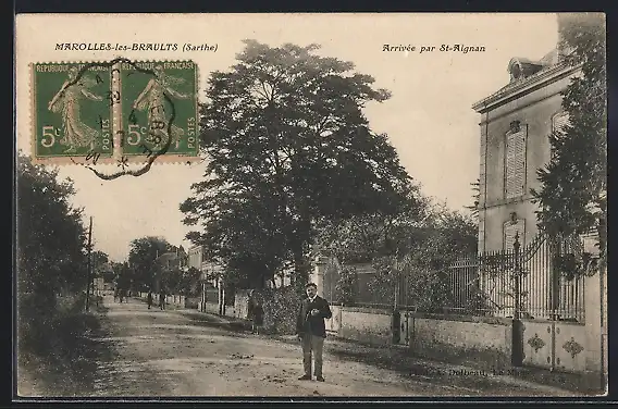 AK Marolles-les-Braults, Arrivée par St-Rigomier avec vue sur une rue bordée d`arbres et de maisons