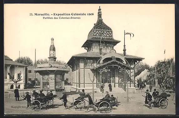 AK Marseille, Exposition Coloniale 1906, Pavillon des Colonies diverses mit Rikschas, Ausstellung