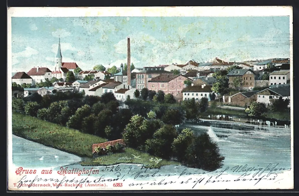 AK Mattighofen, Ortsansicht mit Gewässer aus der Vogelschau