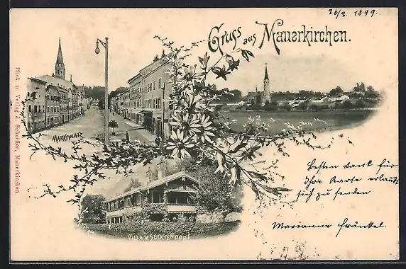 AK Mauerkirchen, Villa v. Secktendorf, Totale, Marktplatz, Blumen