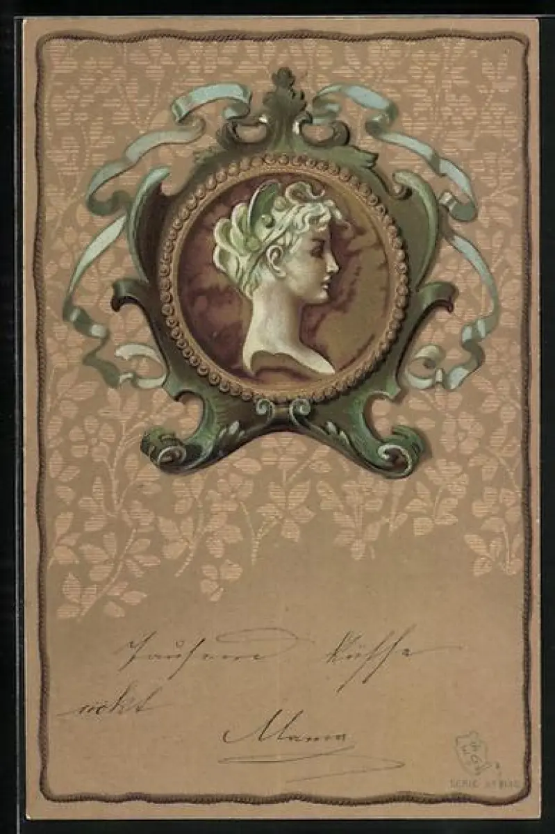 AK Medaille mit Reliefportrait eines Mädchens, Jugendstil