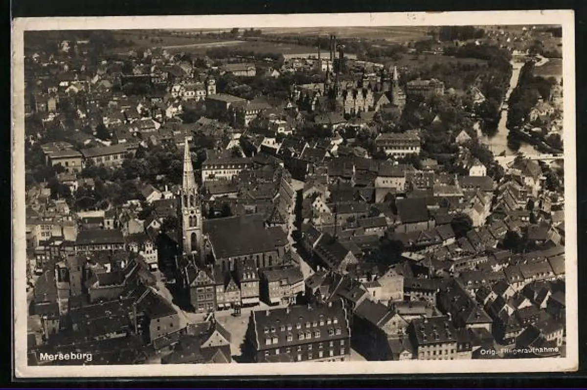 AK Merseburg, Teilansicht mit Kirche, Fliegeraufnahme