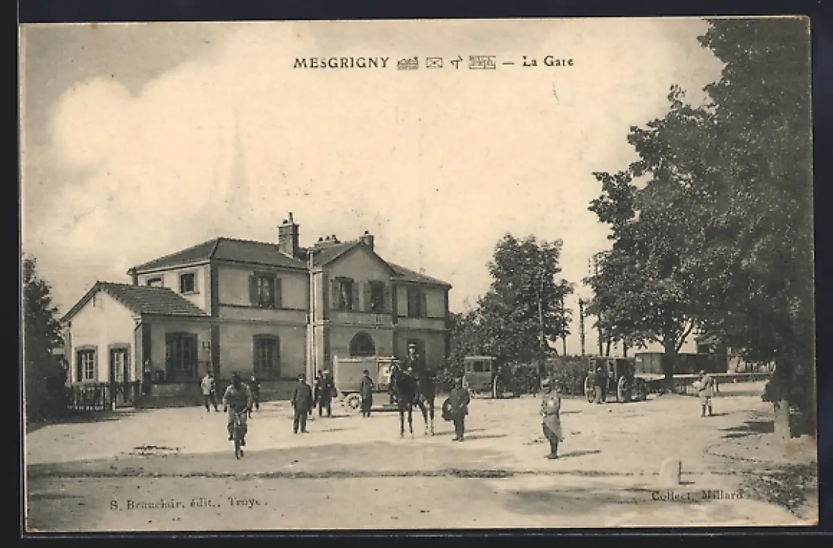 AK Mesgrigny, La Gare, Soldaten vor dem Bahnhof