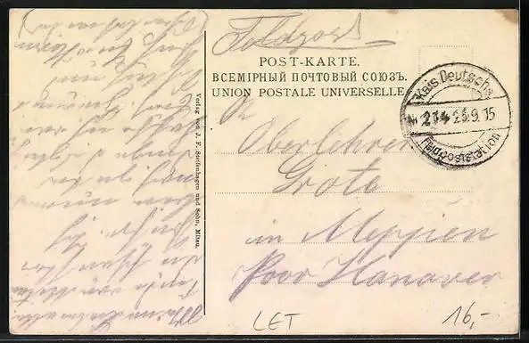 alte Ansichtskarte, gelaufen, Eckknicke oben und unten, Bugspur li. unten