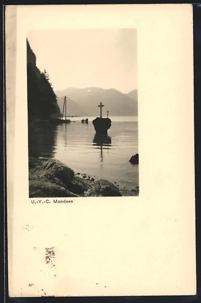 AK Mondsee, Uferpartie mit Bergen
