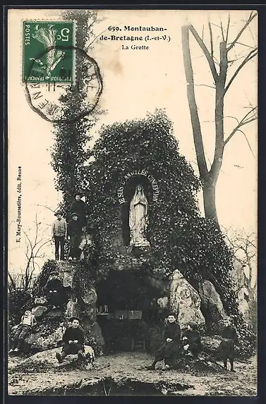 AK Montauban-de-Bretagne, La Grotte avec statue de la Vierge