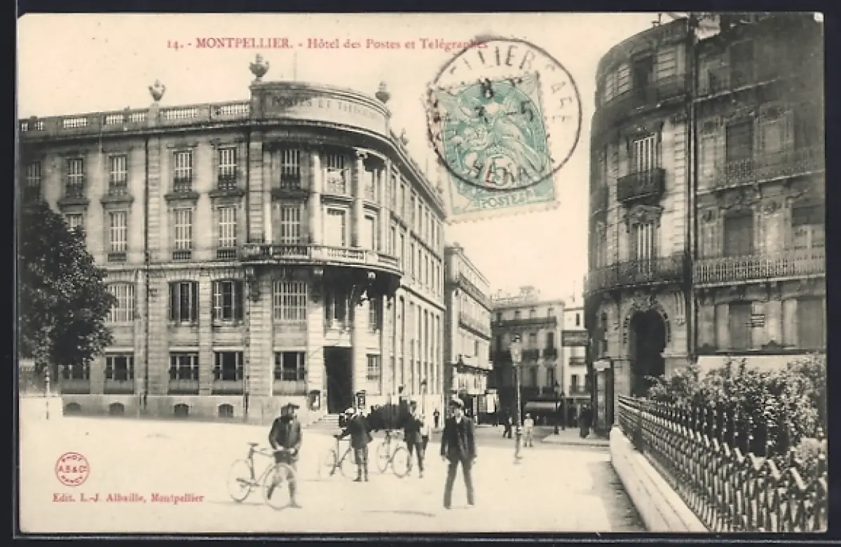 AK Montpellier, Hôtel des Postes et Télégraphes avec passants et cyclistes