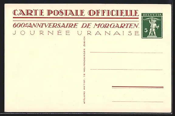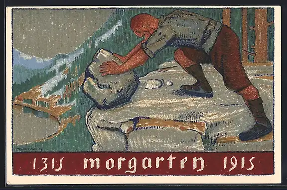 AK Morgarten, 1315-1915, Mann rollt Gesteinsbrocken den Felsen hinunter