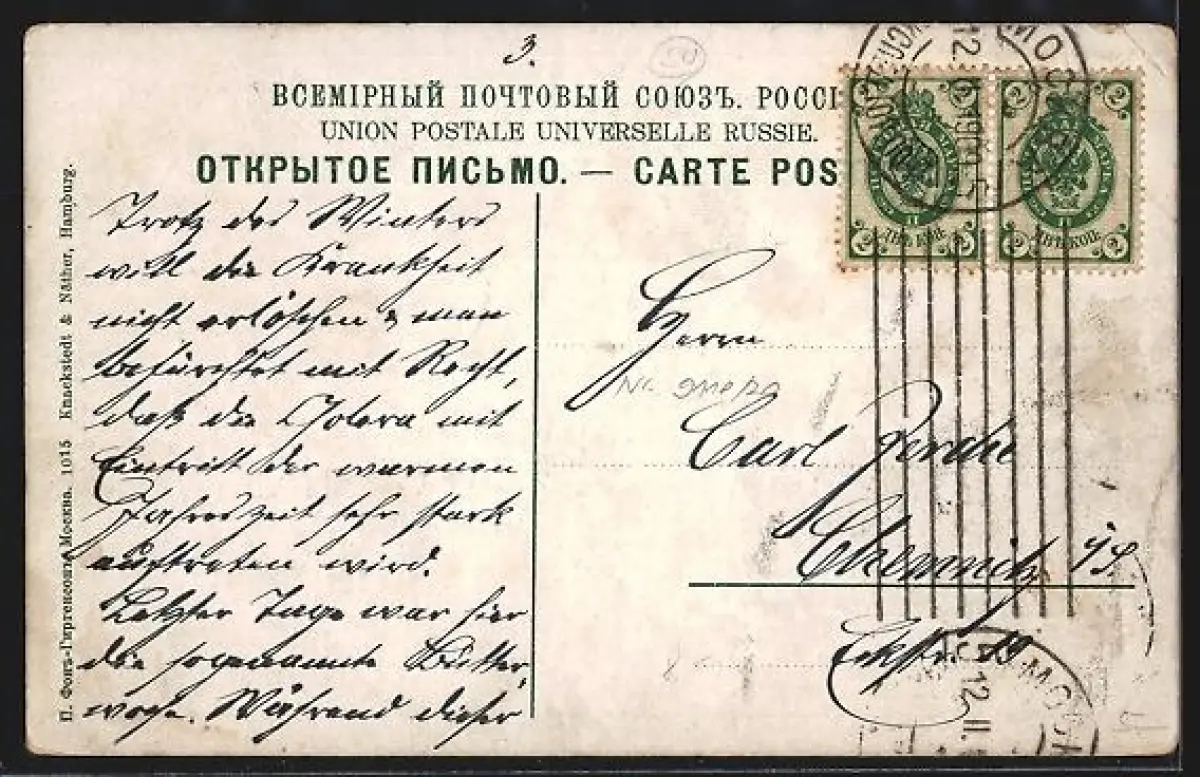 Personenbezogene Daten auf der Rückseite der Karte wurden durch blauen Textmarker unkenntlich gemacht. Die blauen Stellen sind auf die Vorderseite durchgeweicht und wirken sich negativ auf das Postkartenfoto aus