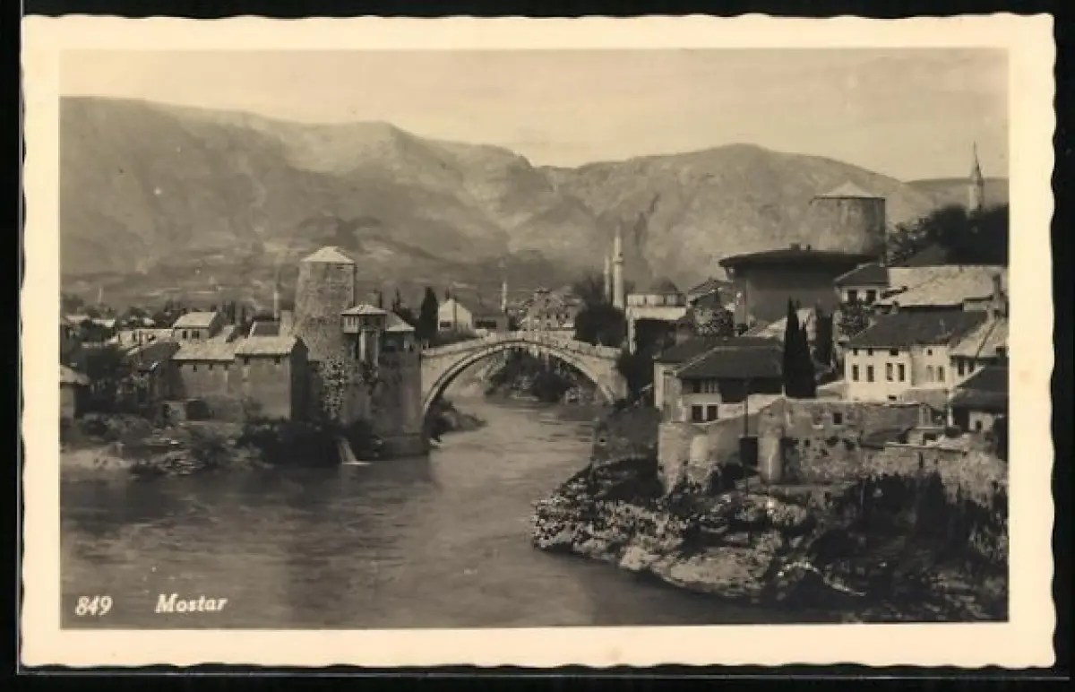 AK Mostar, Ortspanorama mit Brücke aus der Vogelschau