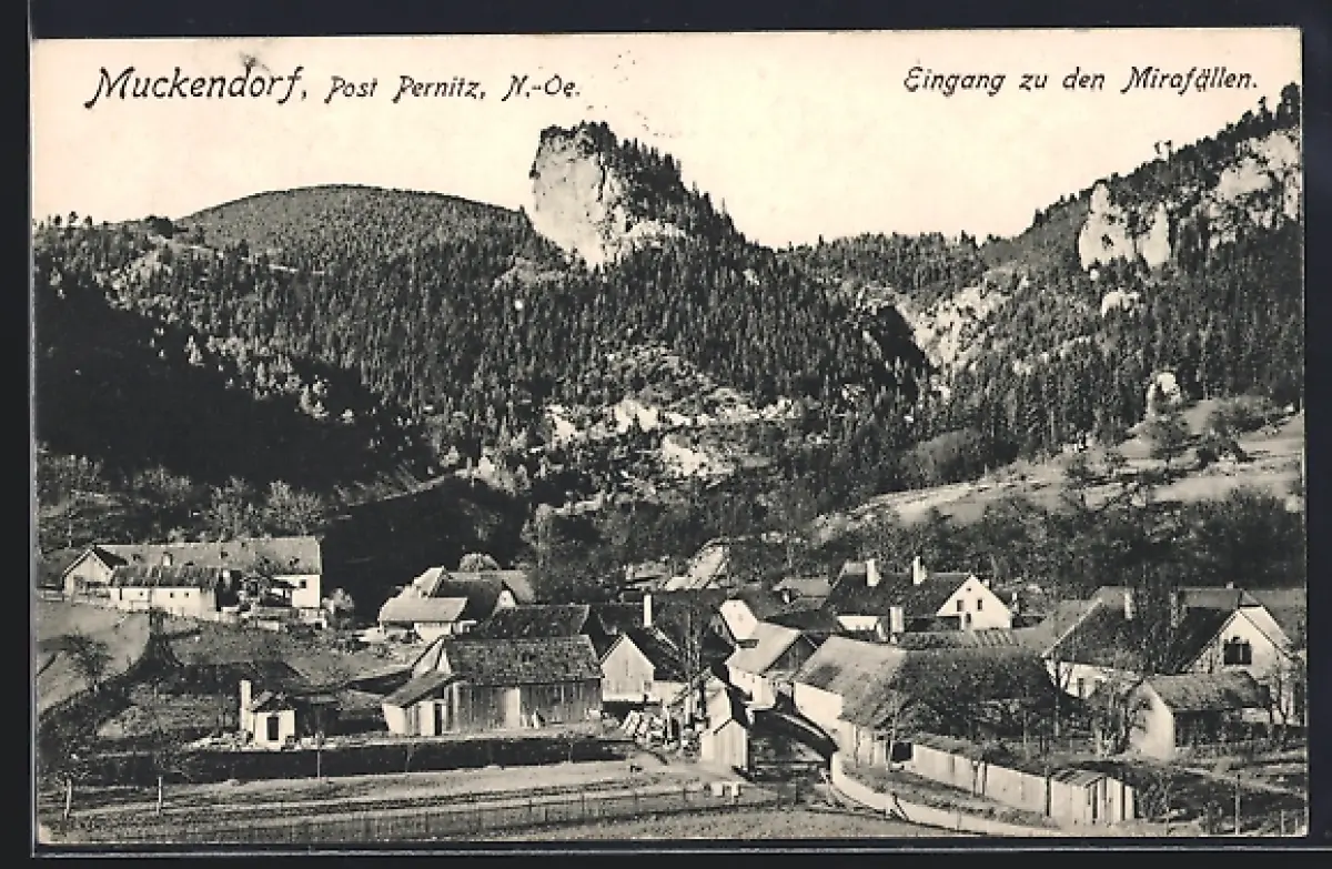 AK Muckendorf, Ortsansicht mit dem Eingang zu den Mirafällen