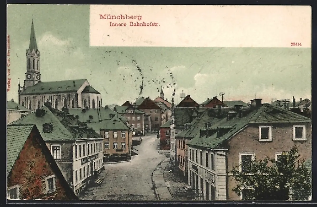 AK Münchberg, Innere Bahnhofstrasse mit Kirche
